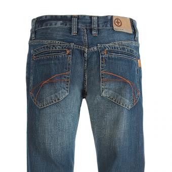 Die modische und schmale Herrenjeans von Kuyichi. Schmale Low Boot Jeans mit geradem Beinschnitt. Gefertigt ist die Jeans aus 16/23 Rusty Denim in dunkler Waschung mit markant starkem Abrieb und aufwändig, von Hand gearbeiteten Used-Effekten.